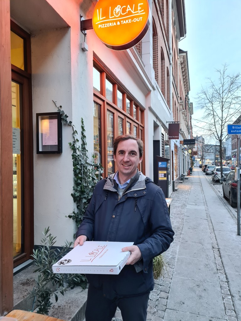 Nu er det blevet søndag og min tur til at takke af. Det er også blevet tid til lidt nemt og godt at spise, så jeg er gået ned i Guldsmedgade for at hente pizza hos Il Locale.