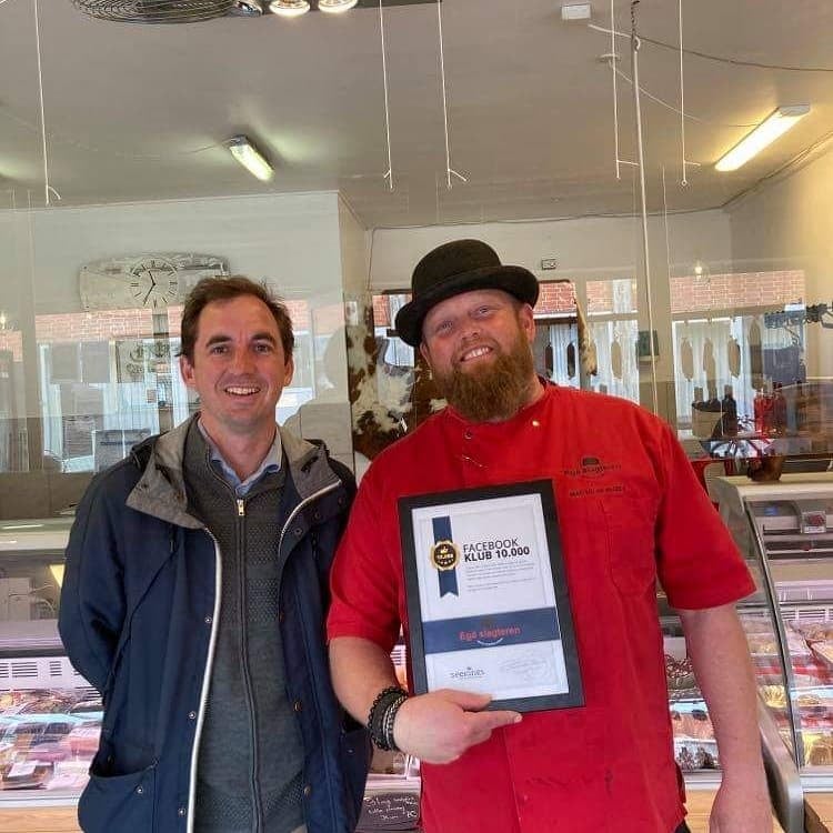 Igår var jeg forbi den hyggelige slagterbutik på vej hjem, hvor han stolt viste sit diplom med over 10.000 likes på Facebook.