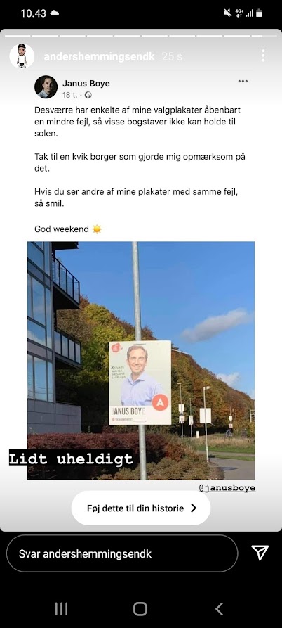 Den kan du læse her: Janus Boye fjerner valgplakater: ‘Jeg vil ikke være kendt som røvdrengen’