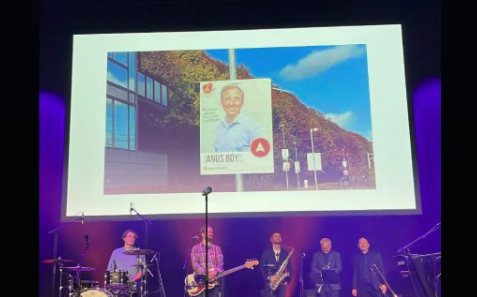 I år med Anders Breinholdt fra Natholdet som vært og han vælger så at starte hele showet med en lille sketch om kommunalvalget. Naturligvis med min plakat.