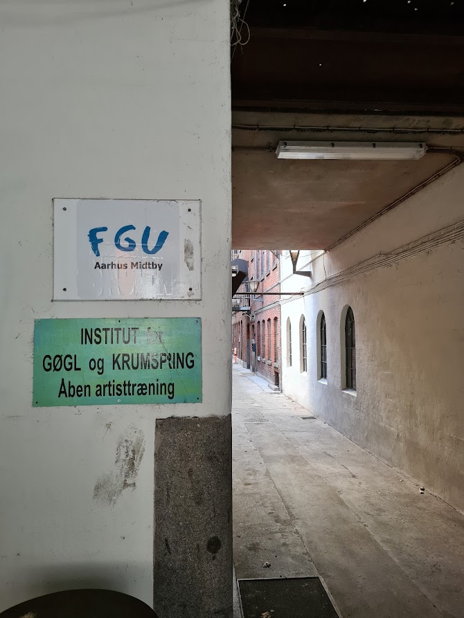 Se om du kan finde skiltet med Institut for Gøgl og Krumspring. Her afholdes åben artisttræning, som der står på skiltet. Skiltet viser også at Elvirasminde også er hjem for Gøglerskolen, som hører under FGU. Gøglerskolen er en produktionsskole med ca. 200 elever og 9 linjer inkl. dans, artist, træ & design.